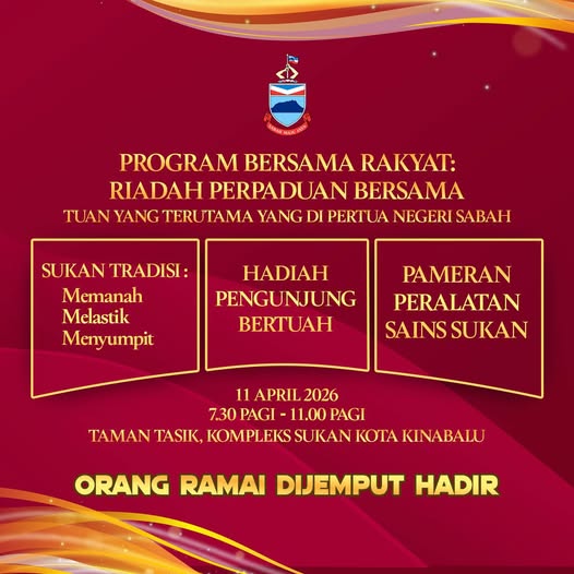 Lembaga Sukan Sabah dengan sukacitanya menjemput orang ramai untuk hadir ke Program Bersama Rakyat : Riadah Perpaduan Bersama Tuan Yang Terutama Yang Di-Pertua Negeri Sabah yang akan berlangsung seperti ketetapan berikut: